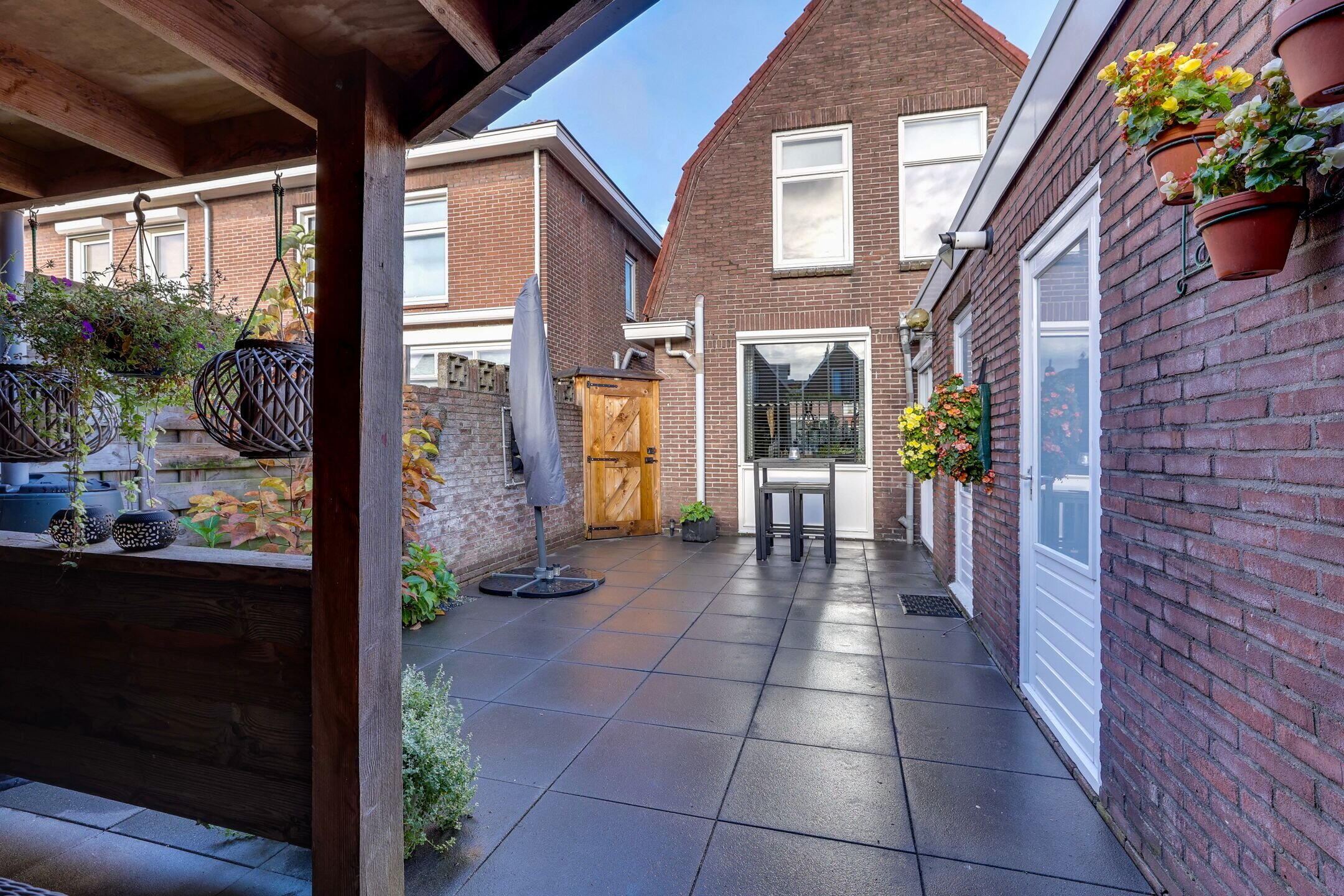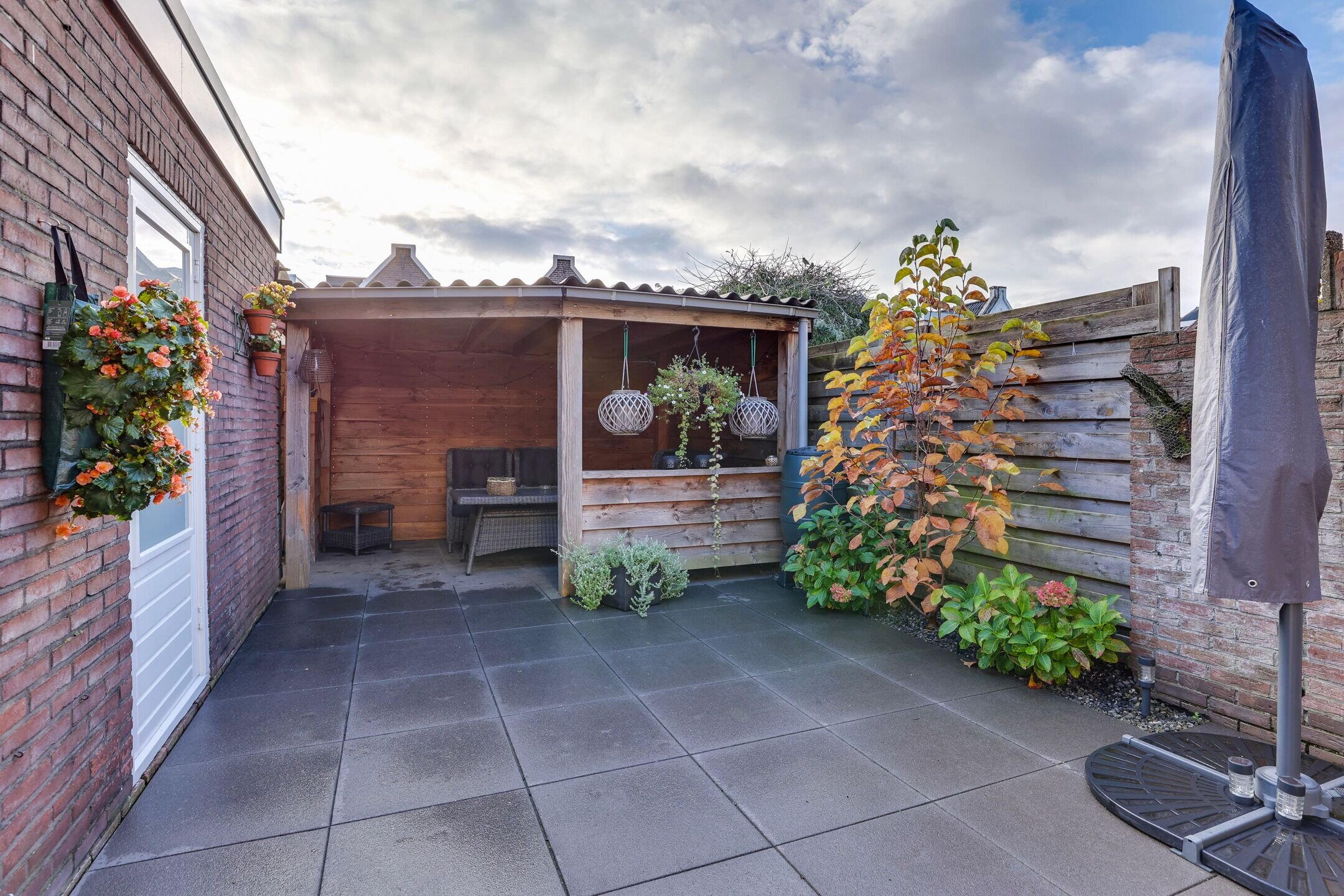 De voortuin vormt een prettige buffer tussen woning en straat en zorgt voor extra privacy. Naast de woning loopt een steeg naar de verzorgde en onderhoudsvriendelijke achtertuin op het zuidoosten, die ook via de bijkeuken bereikbaar is. Achterin bevindt zich een gezellige veranda met stalling – ideaal voor fietsen of tuingereedschap.